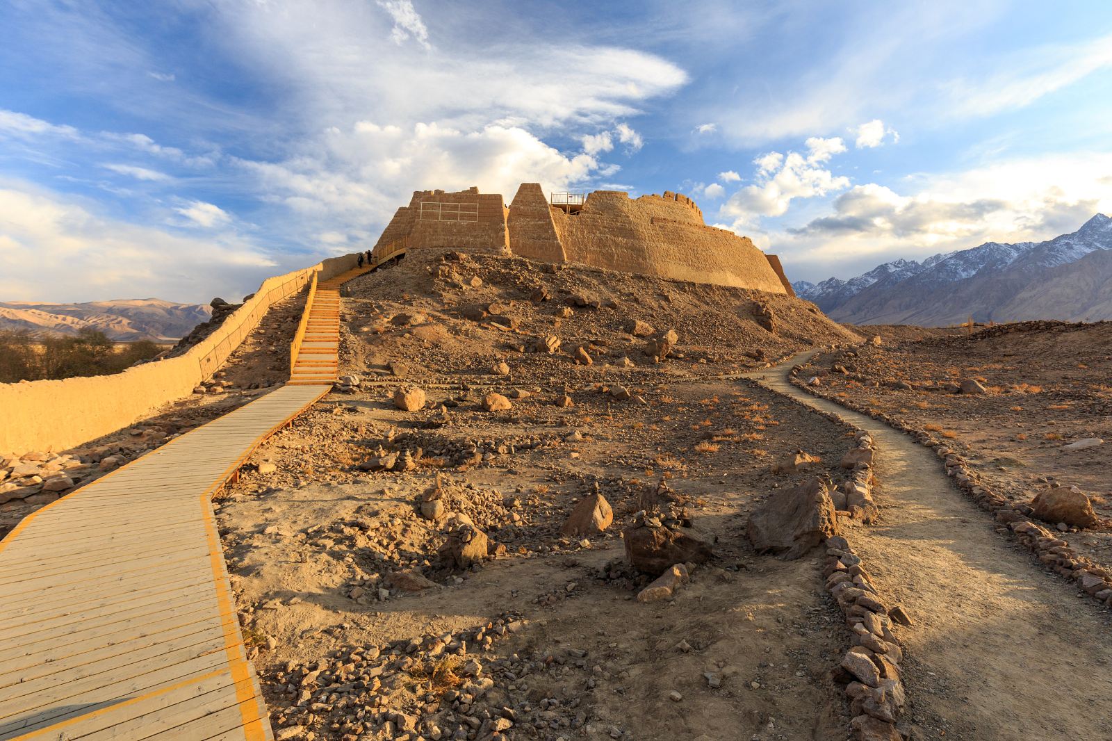 喀什古石头城位于喀什地区塔什库尔干县的县城东北侧,曾经是古代“西域三十六国”中蒲犁国的王城,也是古丝绸之路上的重要一站。石头城在朅盘陀时期(大约公元1世纪)就已存在,是新疆珍贵的历史古迹,如今城堡仅剩断壁残垣,游客来此只能参观残破的遗址,另外,修建在山丘之上的落寞古堡也十分适合摄影,可以排除苍凉悲壮的古堡照片。古石头城建在县城东北侧的山丘上,地势较高,从远处即可拍到。如果想要登上城堡则需要付门票,古城不大,长宽大约300-400米左右,大约1小时左右就可以参观完毕。在古城内可以看到曾经的城郭、屋舍遗址,不过已经残破不堪,只能看着寂静的土墙想象当年繁华的样子。另外,古石头城旁边的金草滩是观看拍摄石头城好的地方,当地已在这里修建了木制栈道方便拍摄。日落时分,夕阳下泛黄的古城显得格外悲壮,是拍照好的时机。