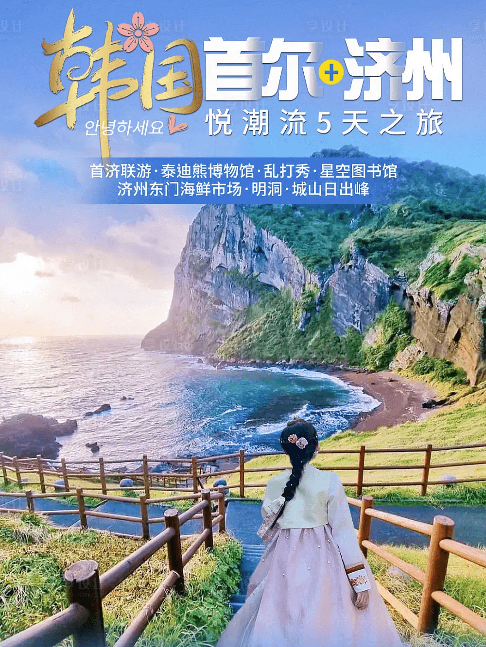 📍行程亮点一览 ✅ 双城深度体验:首尔都市潮流+济州自然秘境 👘 韩服体验+韩屋街旅拍,出片率超高 🏝 济州岛双路线探索,打卡火山奇景与海岸悬崖 🍲 精选韩食餐厅,含黑猪肉、石锅拌饭、人参鸡等特色料理 🧳 全程舒适酒店+贴心安排自由时光,既能拍照也能放松 ✅ 中文领队+当地中文导游全程服务